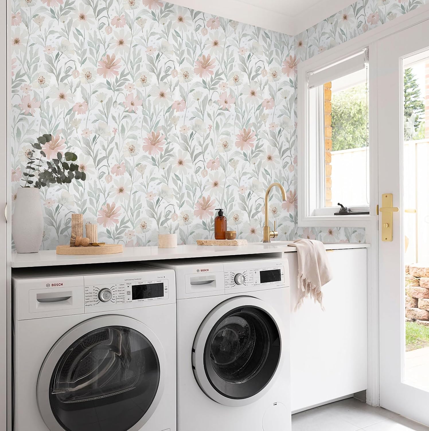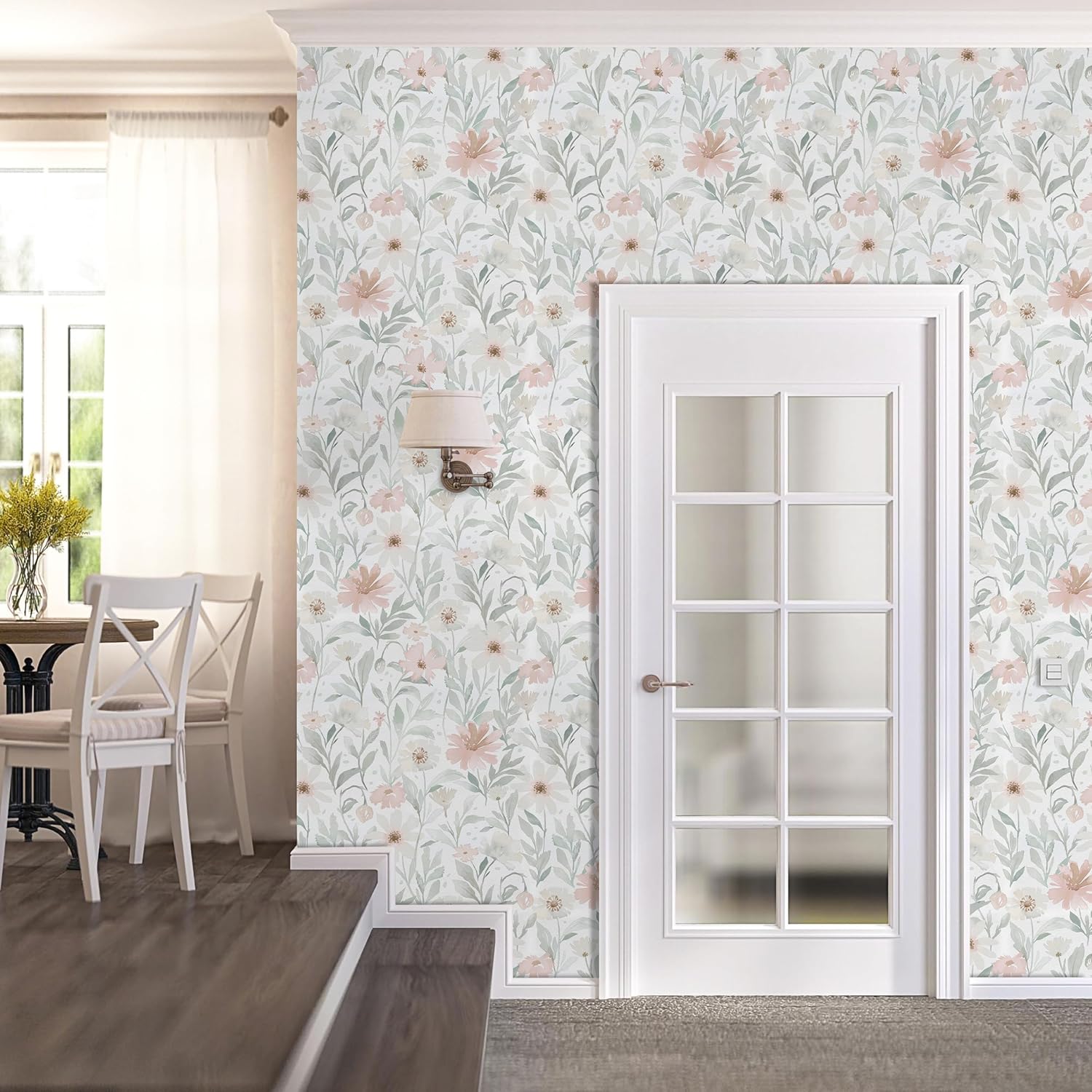 CiCiwind Pink Floral Peel and Stick Wallpaper Farmhouse Removable Self Adhesive Modern Wall Paper for Bedroom Bathroom Light Green Leaf Contact Paper for Cabinets Shelf Drawer 17.3" × 78.7"