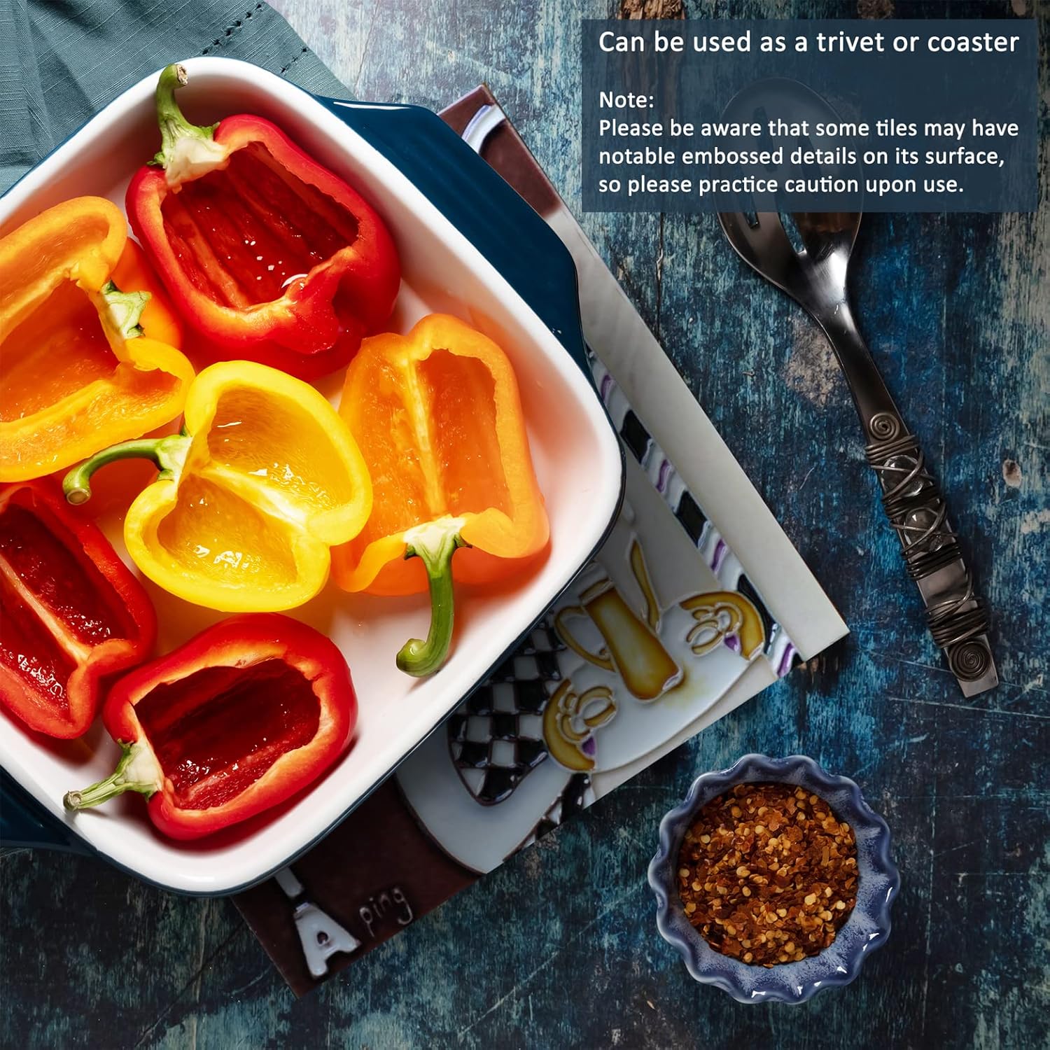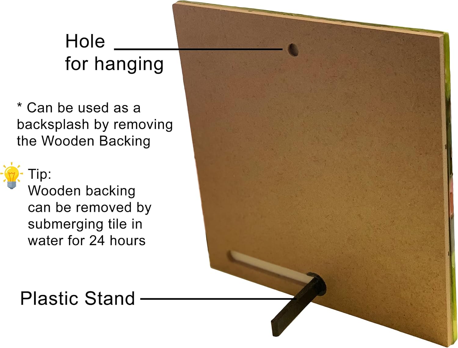 Hand Painted, glazed, and kiln fired ceramic decorative art tile. Easy to clean, can be used as hot plate. Each tile comes with a pre-attached packing that enable it to be hung on the wall or stand up as a picture with the build in easel stand.