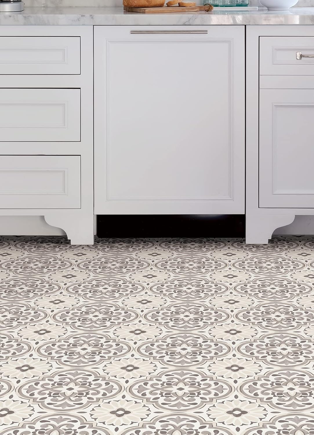 Whether you're a farmhouse enthusiast or simply looking to revamp the look of your floors, this grey and cream peel and stick floor tile is just for you! Its versatile color palette and painterly style will give your floors chic flair. Massimo Peel and Stick Floor Tiles contains 10 pieces on 10 sheets that measure 12 x 12 inches. This product measures 60in x 24in x 0.06in when assembled.