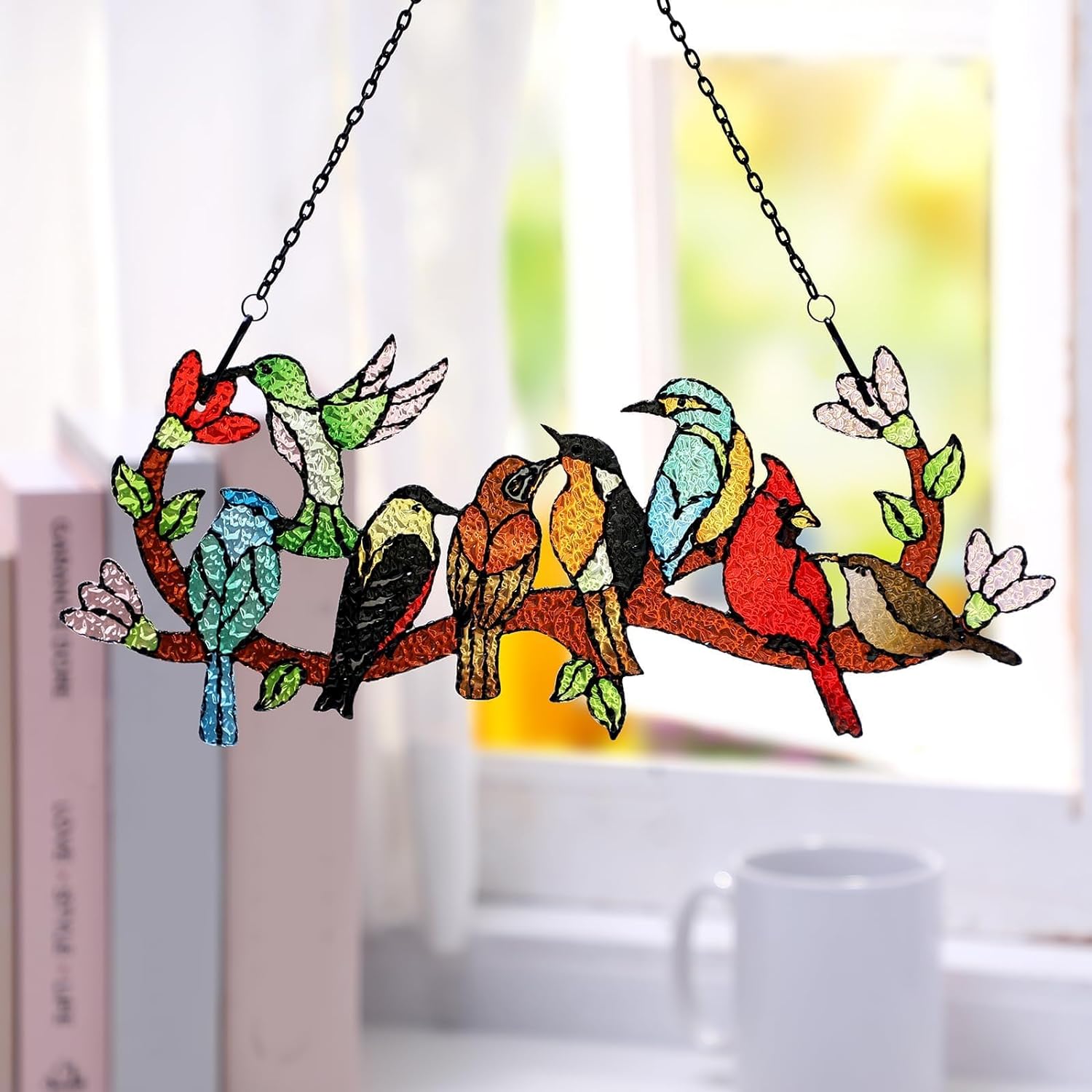 Huray Rayho Birds On Branch Stained Glass Suncatcher Cardinal Hummingbird Kingfisher Double Side Glass Panel Window Hanging Decor Bird Ornament Bird Lover Gift for Mom Grandma