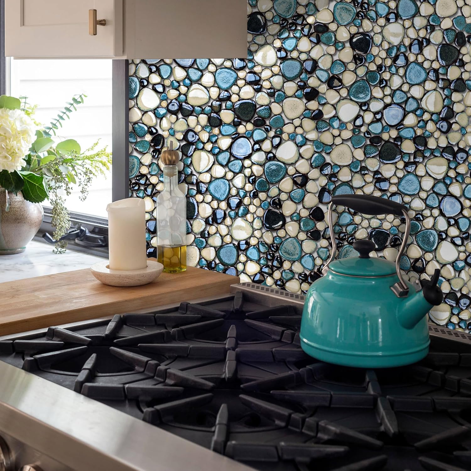 The glazed surface makes the pocelain pebble tile super easy to clean. Good choice for kitchen backsplash.